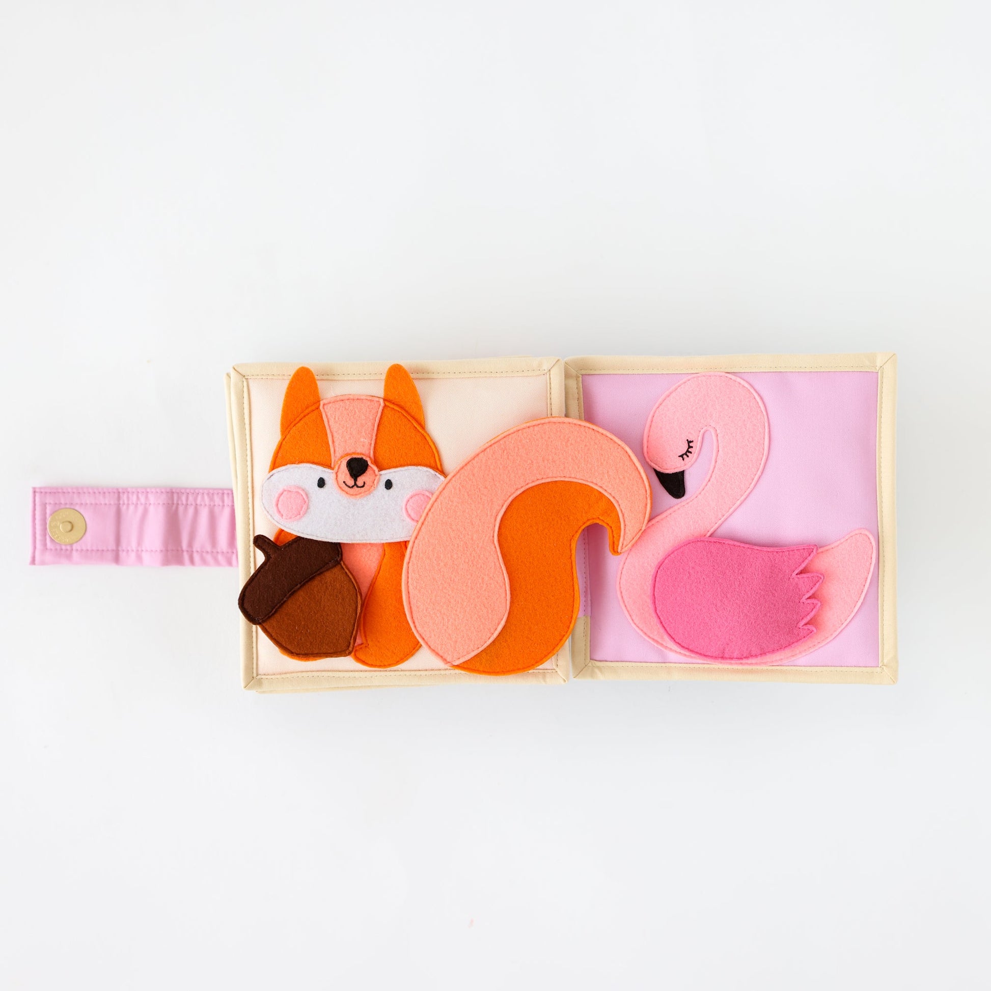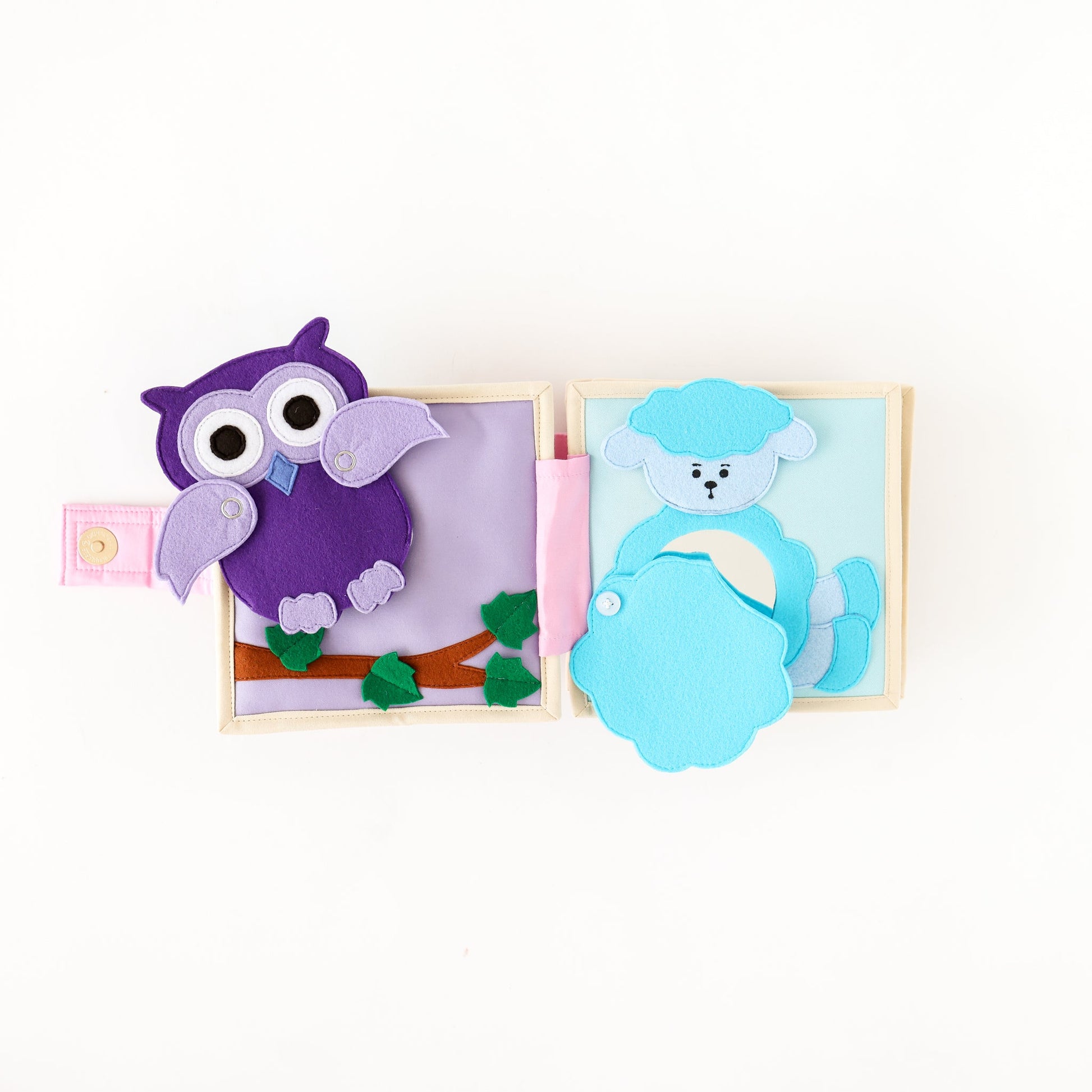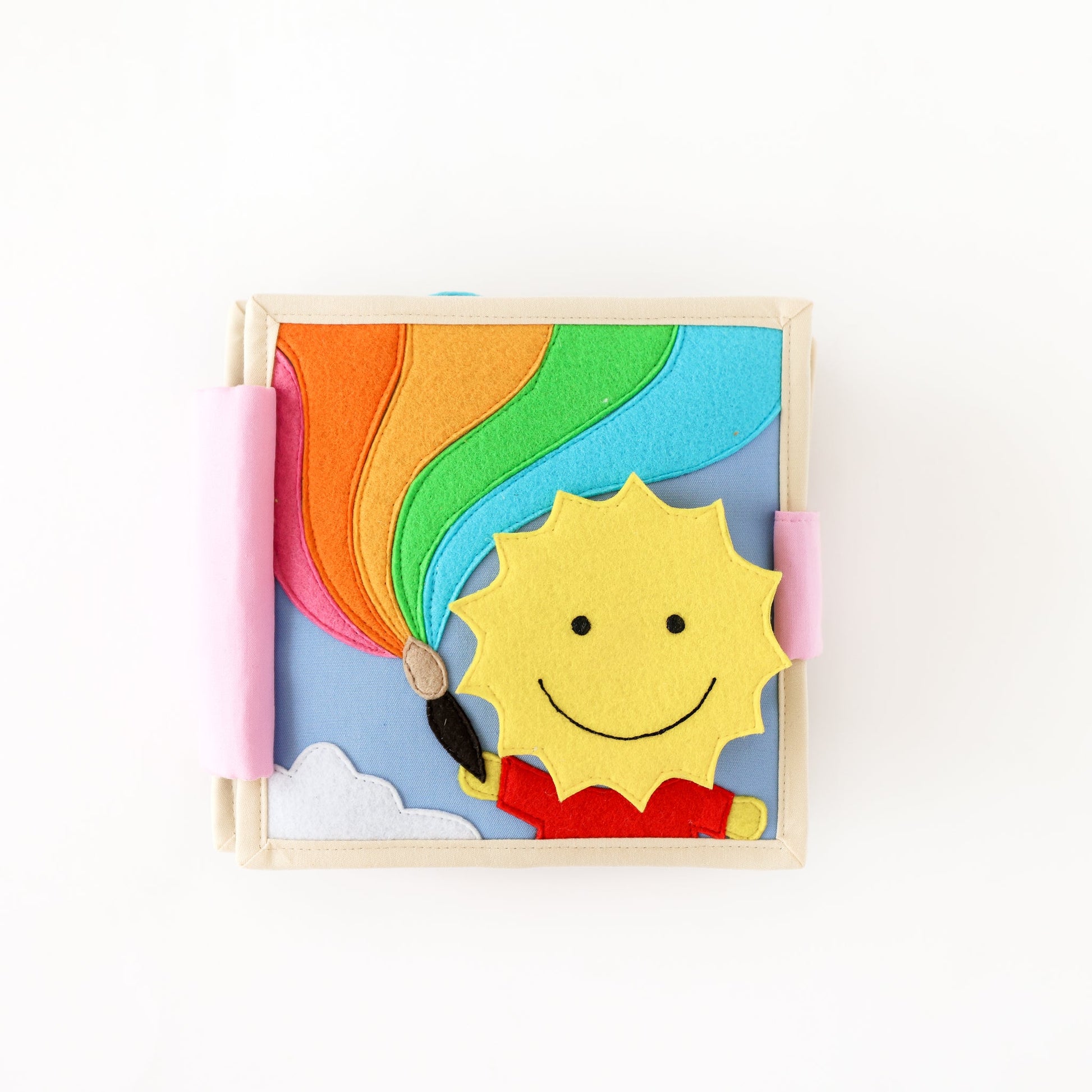 This beautiful rainbow themed quiet book has it all! With sensory play, a rattle, cause and effect activities, extra-large finger puppet, stand-alone mirror, and creative play all crammed into this sweet little diaper bag companion, all we can say is, goodbye fussiness on the go!!
